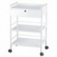 Bílý kosmetický stolek s třemi odkládacími policemi a s jednou zásuvkou.