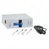 Bílý kosmetický stolek s třemi odkládacími policemi a s jednou zásuvkou.